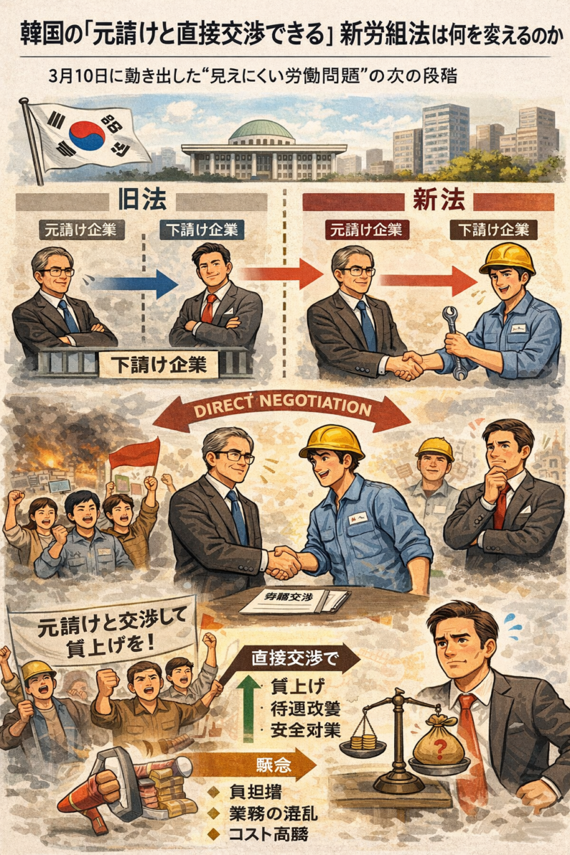 韓国で2026年3月10日に施行された改正労組法は、下請け労働者が元請け企業にも団体交渉を求めやすくする制度変更だ。日本では大ニュースではないが、サプライチェーン時代の雇用責任を問い直す社会ニュースとして注目に値する。 -