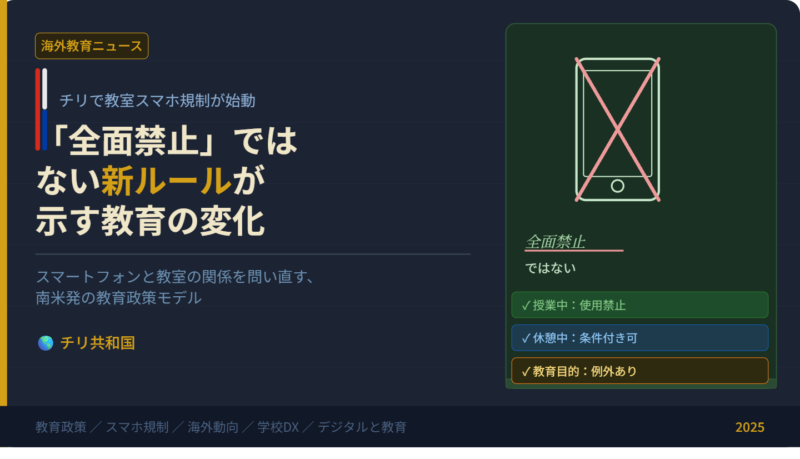 2026年3月、チリで学校内のスマートフォン利用を新たに規制する法律が動き出した。全面持ち込み禁止ではなく、授業中の原則禁止と例外の明文化を組み合わせた制度で、教育現場の「画面との距離感」を見直す動きとして注目される。 -