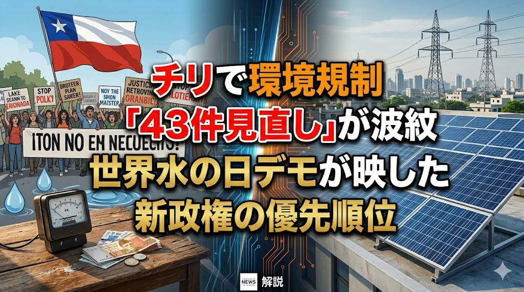 チリでいま起きているのは、単なる環境政策の微修正ではありません。ホセ・アントニオ・カスト大統領の新政権が発足直後に43件の環境関連規制を差し戻して再検討したことで、3月22日の世界水の日には各地で抗議デモが広がりました。争点は「環境か成長か」という二択ではなく、水資源、鉱業、地域の暮らし、そして国家の優先順位をどこに置くのかです。