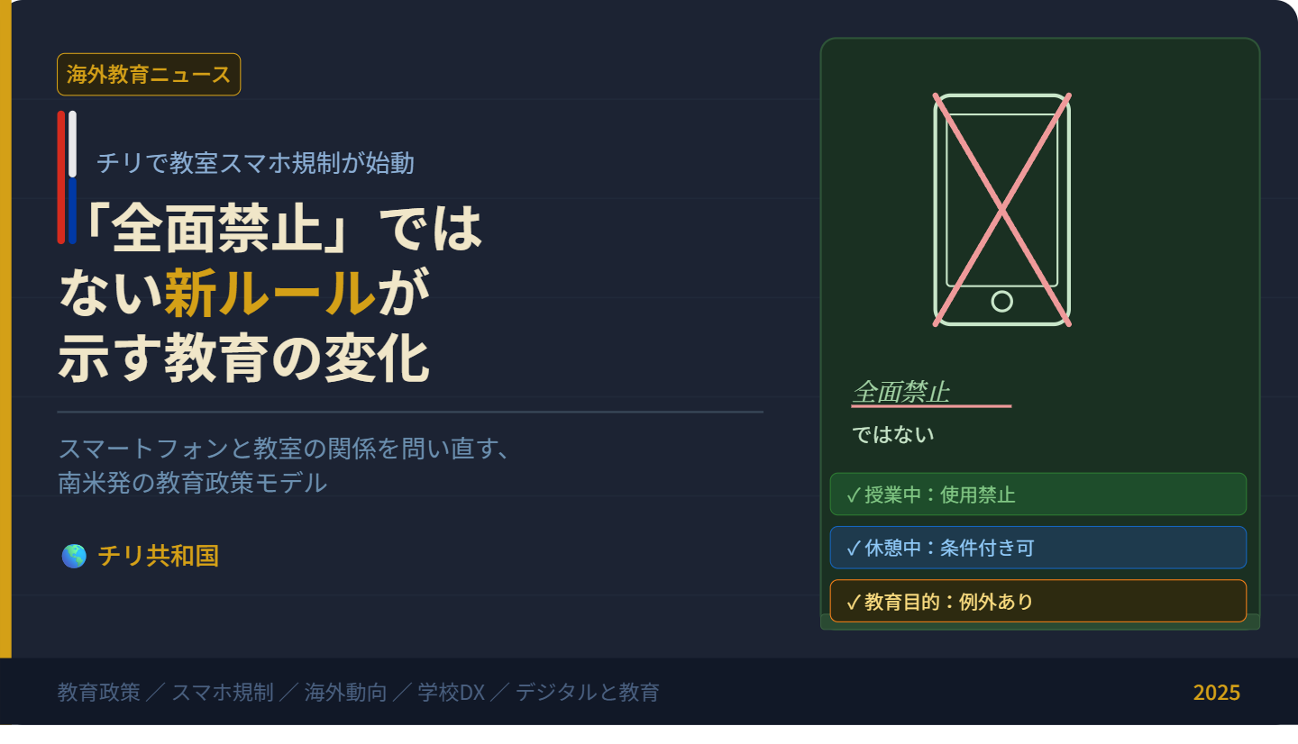 日本でも学校でのスマホ利用はたびたび議論になるが、チリの事例は「禁止か自由か」の二択ではない。集中、対人関係、保護者の安心、教育でのデジタル活用をどう両立させるかを、制度として整理し始めた動きとして見ると面白い。