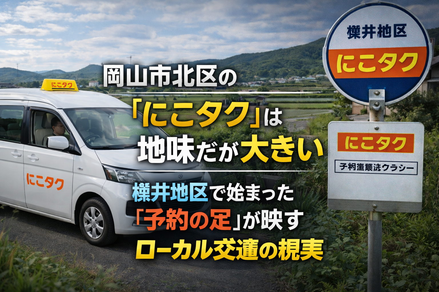 岡山市北区横井地区で、予約制の乗合タクシー「にこタク」の試験運行が2026年3月2日に始まった。全国ニュース級の派手さはないが、通院や買い物の足を地域でどう守るかという、かなり生活に近い問題を正面から扱う動きだ。ローカルの小さな交通ニュースに見えて、実は高齢化と交通空白に向き合う全国的な課題がそのまま詰まっている。
