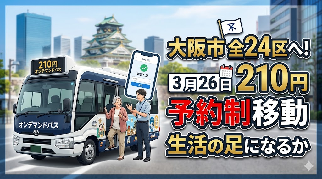 大阪市では2026年3月26日から、新たに8区でAIオンデマンド交通の社会実験が始まり、これで市内全24区で予約型のオンデマンドバスが動くことになります。料金は大人210円で、アプリ、LINE、電話から予約できます。全国トップ級の大ニュースではありませんが、「駅や路線バスだけでは埋まらない日常の移動」をどう支えるかという意味で、かなり生活に近いローカルニュースです。