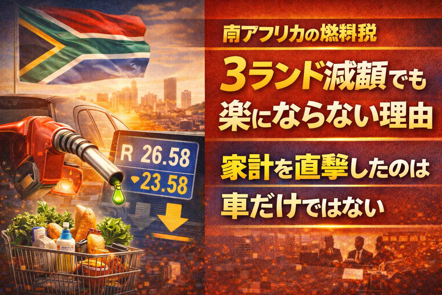 南アフリカでは2026年4月1日、政府がガソリンと軽油の一般燃料税を1か月だけ1リットル当たり3ランド引き下げました。結論から言えば、それでも家計の痛みはかなり重いです。ガソリンはなお3.06ランド、軽油は7.37〜7.51ランド上がり、さらに低所得世帯が使う照明用パラフィンは11.67ランド上昇しました。