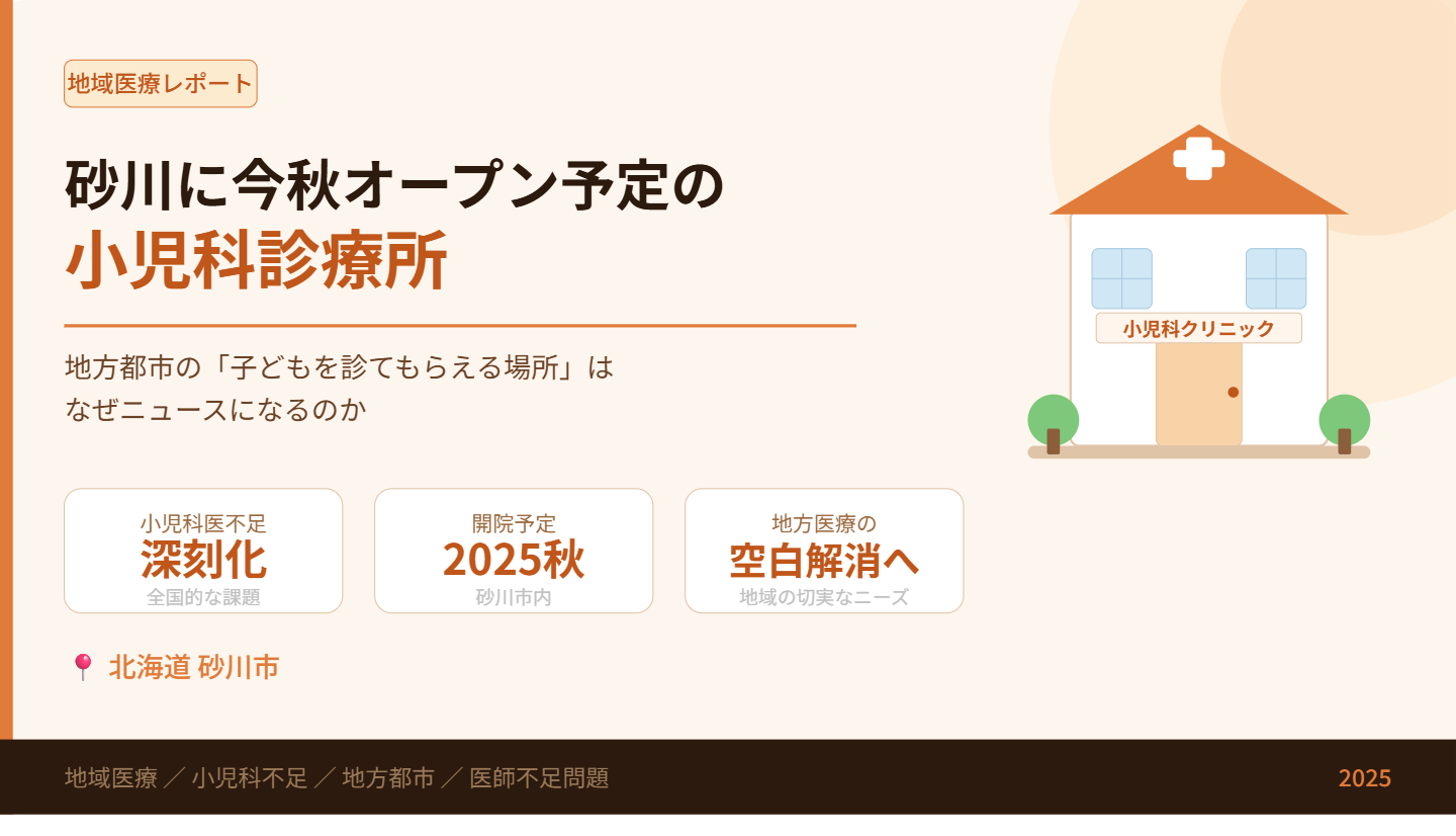 北海道砂川市で、2026年秋に小児科診療所が開設される見通しになった。全国的なトップニュースではないが、子育て世帯にとってはかなり実務的で切実な話だ。自治体が最大1億5,000万円の開業医誘致制度を用意し、それが実際の開設につながったとみられる点も重要で、地方都市の地域医療をどう支えるかという論点が詰まっている。