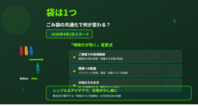 熊本市では2026年4月1日から、燃やすごみと埋立ごみで共通の指定収集袋が使えるようになる。値上げではなく利便性改善が主眼だが、分別ルールは変わらないため、暮らしの現場では意外に重要な変更だ。 -