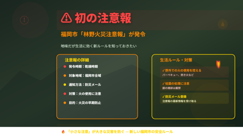 福岡市で2026年3月11日、制度開始後初めて林野火災注意報が発令された。春先の乾燥期に、たき火や火入れ、喫煙といった身近な行動がどう変わるのかを整理する。