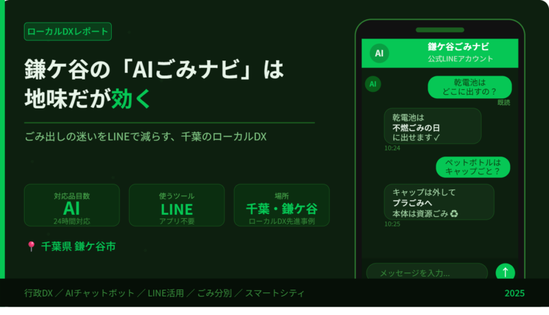 千葉県鎌ケ谷市が2026年度からLINEベースの「鎌ケ谷AIごみナビ」に切り替える。旧アプリ終了と集積所掲示の廃止が重なるため、これは単なるDXではなく、毎週のごみ出し導線を作り替えるニュースだ。