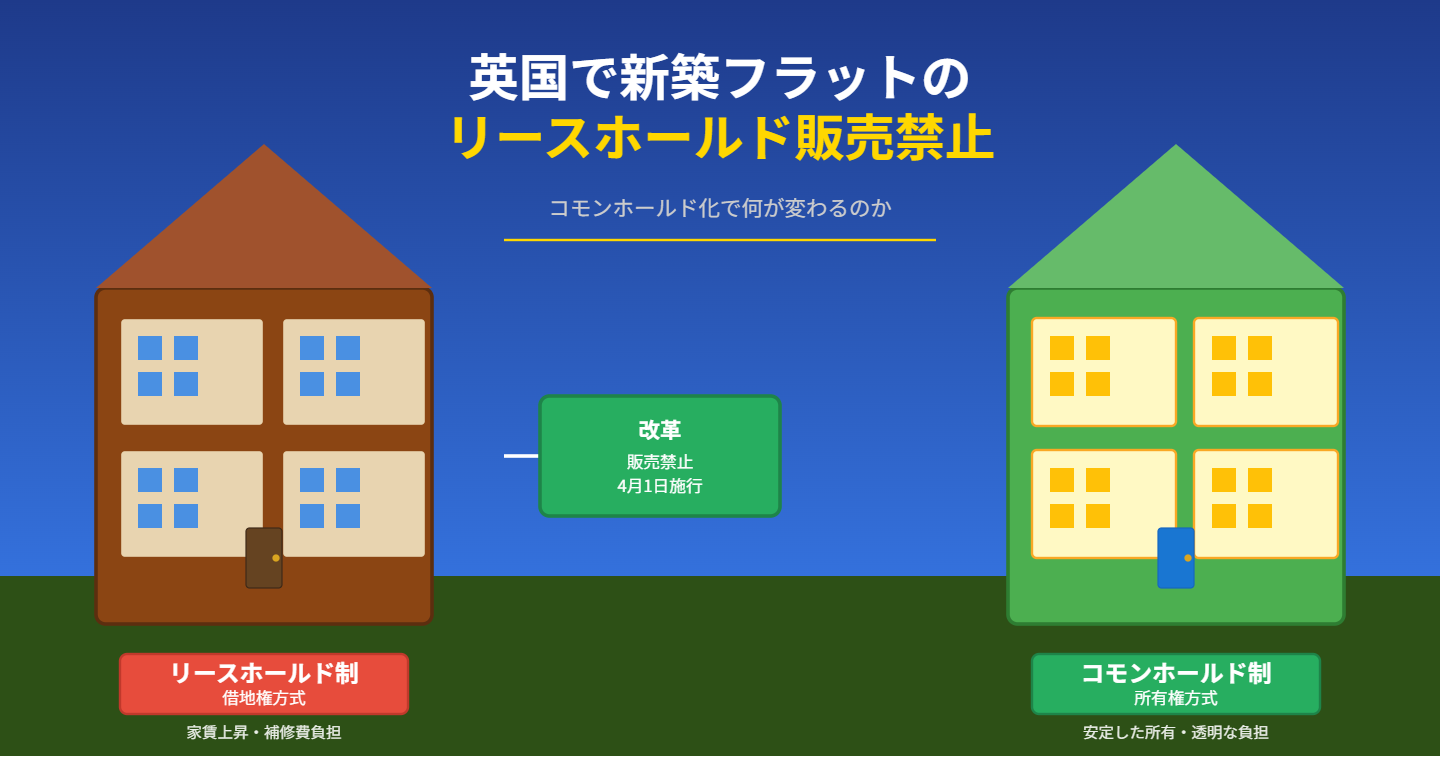 英国政府は2026年1月27日、イングランドとウェールズで新築フラットを原則としてリースホールドで売れなくする方針を打ち出し、コモンホールドを標準形にするための協議を始めた。結論から言えば、今後の購入者にとっては「期限つきの権利を買う」形から、「建物運営に投票権を持つ恒久的な所有」に寄せる改革だ。