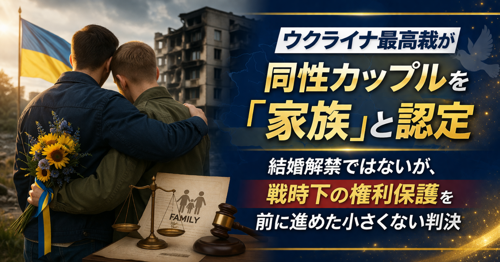 ウクライナで2026年2月25日、最高裁が同性カップルを「事実上の家族」と認めた下級審判断を維持した。これは同性婚の合法化ではないが、同性パートナーが法的にまったく見えない存在ではなくなりつつあることを示す判決だ。戦時下で家族の定義がそのまま生活上の権利に直結する国だけに、このニュースは見た目以上に重い。