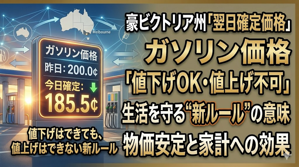 オーストラリア南東部のビクトリア州で、ガソリン価格を前日に公表し、当日は途中で値上げできなくする新ルールが2026年3月10日に始まった。州政府は生活費対策として打ち出しているが、これは行政が小売価格の上限を一律に決める制度ではない。各スタンドが自分で翌日の上限価格を申告し、その日の途中では上げられなくする「透明化と予見可能性」の制度だ。