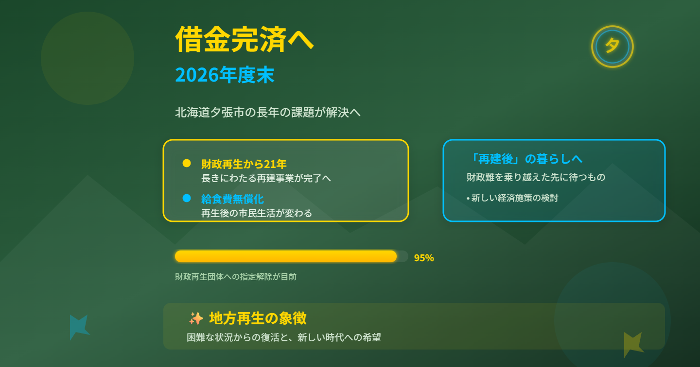 北海道夕張市が、2026年度末、つまり2027年3月末までに財政再建のための借金を完済する見通しになりました。これは地味な地方ニュースに見えて、実はかなり重い話です。返済完了は明るい節目ですが、暮らしが一気に楽になる話ではなく、人口減少や医療、公共サービスの薄さという次の課題がもう前面に出ているからです。